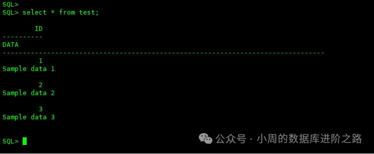 SQL>INSERTINTO test (id, data)VALUES(3,'Sample data 3');