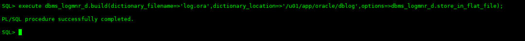 SQL> execute dbms_logmnr_d.build(dictionary_filename=>'log.ora',dictionary_location=>'/u01/app/oracle/dblog',options=>dbms_logmnr_d.store_in_flat_file);