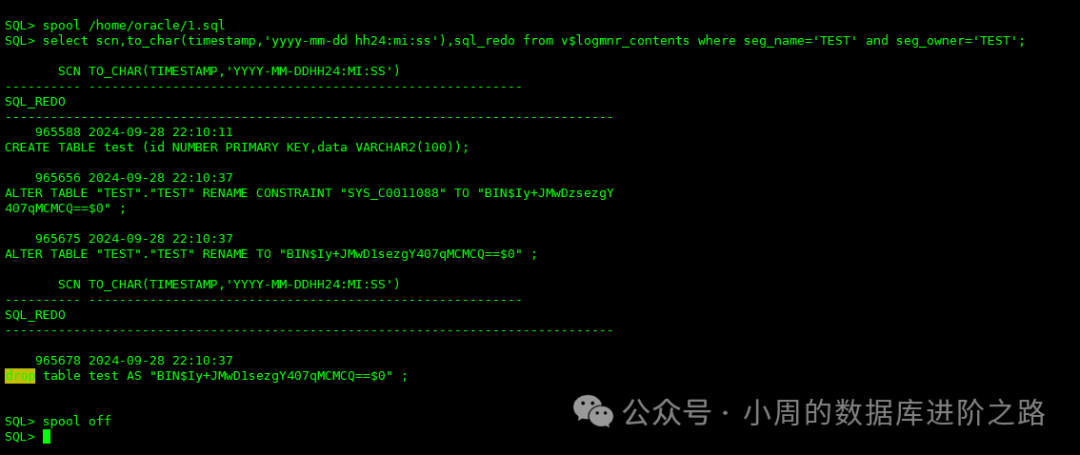 SQL>select scn,to_char(timestamp,'yyyy-mm-dd hh24:mi:ss'),sql_redo from v$logmnr_contents where seg_name='TEST' and seg_owner='TEST'; #这里填误删除数据的用户和表
