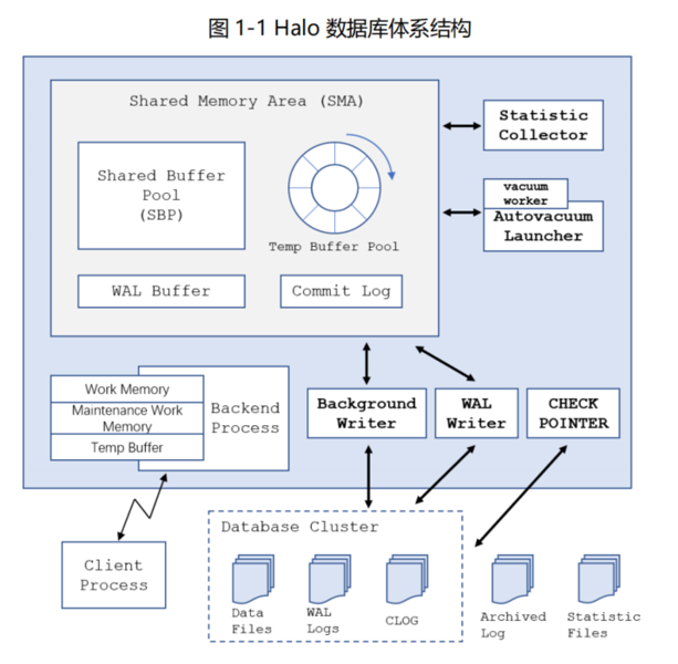 如下图1-1所⽰,Halo数据库的体系结构。数据库实例主要包含共享内存区域、本地内存区域和⼀系