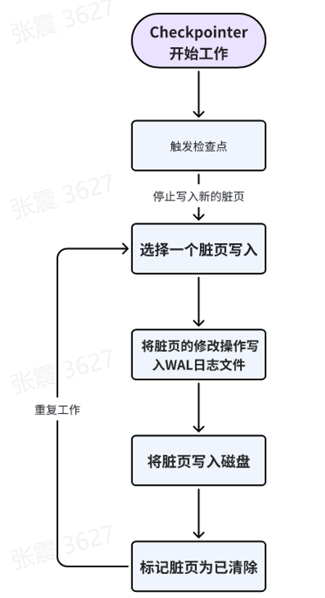 b.写⼊脏⻚:⼀旦检查点被触发,Checkpointer开始将脏⻚(已被修改但尚未写⼊磁盘)写⼊磁盘。 脏⻚是指在内存中已被修改的数据⻚。