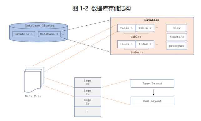 应关系,该⽂件下下存放该库的表,索引等数据⽂件。图1-2描述了这种关系。其中,表的数据⽂件 内部⼜被划分为固定⻓度的⻚(Page),通常为8KB。每个⽂件中的⻚从0开始按顺序编号,该编号 即为⻚号。⻚通常⼜被划分为⻚头和数据,即PageLayout中的内容。数据按⾏(Row)进⾏存储, 每⼀⾏⼜被划分为⾏头和实际数据,即RowLayout中的内容。索引的布局与表的布局类似。