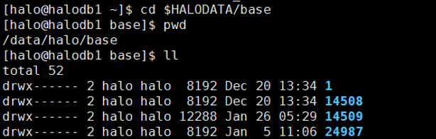 • template0:也是⼀个模板库。和template1的区别在于,通过template1创建的库部分库属性, 如字符集是⽆法更改的。⽽通过template0就可以。 上图所述表空间所存放的物理位置放置在$HALODATA/base⽬录下,该⽬录下的存放很以OID命名的⽂ 件夹,就是该集簇下数据库存放的物理位置。接下来我们看下具体例⼦: 查询⽬前HaloDB中现有的数据库