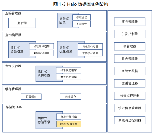 图1-3描述了Halo数据库实例的主要成分。通过插件式内核的设计,可以⾮常灵活的实现多种协