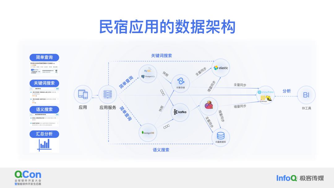 最后是汇总分析需求,用户可能希望知道过去三天某个城市评价最高的民宿有哪些,为了提供这种分析的能力,系统又引入像 Clickhouse、Hive、Snowflake 这类数仓产品。同样需要开发新的同步链路,将数据同步到数仓之中。除此之外,还可以将应用和服务的性能信息写入数仓以便发现和定位性能问题。有了数仓后就可以通过 BI 工具去满足用户的复杂的分析需求了。