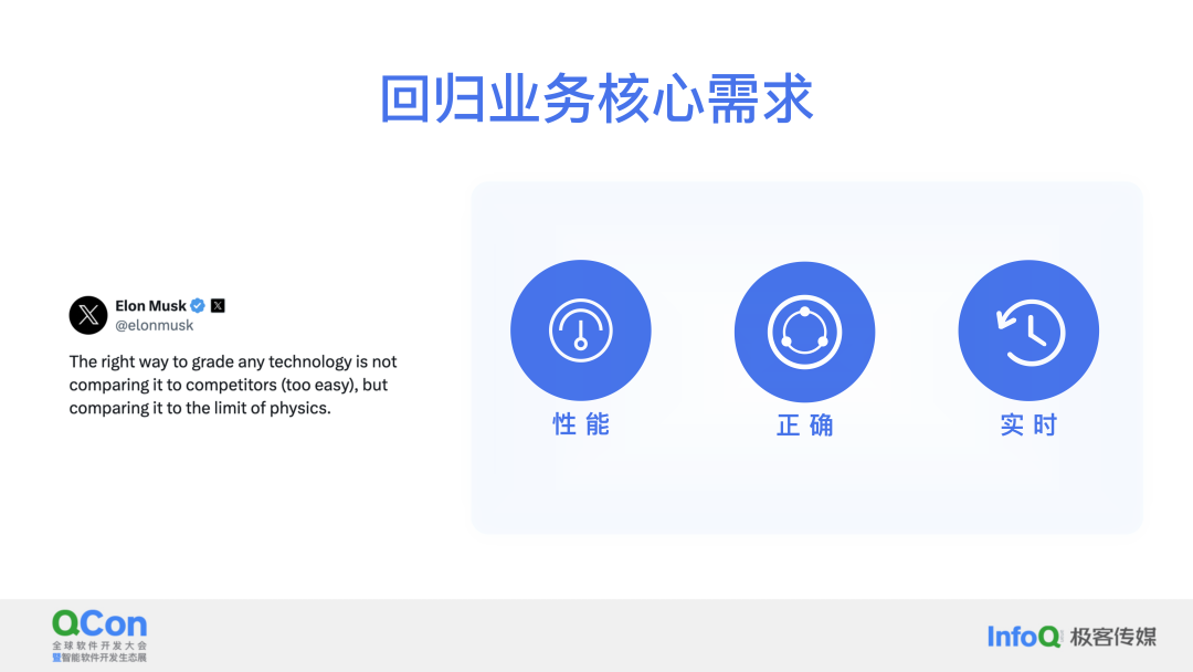 技术服务于业务,让我们先从业务视角出发总结业务的核心需求,我认为业务的核心需求有三个:性能、正确性和实时性。
