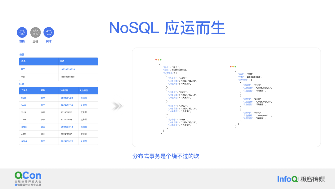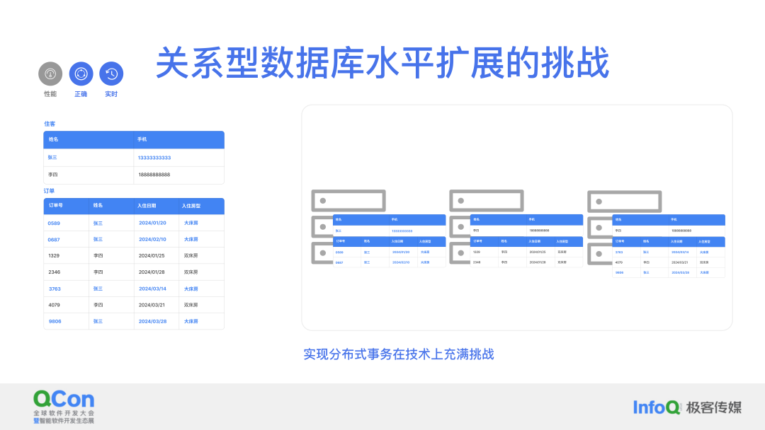 关系型数据库所遇到的唯一挑战是性能问题,它的性能受单机性能的制约,当业务性能需求超出单机性能上限时,单机关系型数据库就难以满足性能需求。一种自然的解决思路是将数据分片存储到多台机器上,通过水平扩展来满足性能需求。然而,在解决性能问题的同时,如何保证数据的正确性将成为挑战。例如,系统中有两张表,一张是住户表,记录了住户的基本信息,另一张是订单表,记录了所有的订单。当这两张表通过分片方式分配到多台机器上时,可能出现住户信息和他的订单信息被分配到不同机器的情况。当需要执行某些操作,如删除某住户时,我们需要删除该住户的基本信息及其所有订单,就需要同时修改多台机器上的数据,而保证这些写操作是原子的且读取时也是原子的,则需要分布式事务。然而,不幸的是实现分布式事务在技术上充满挑战。