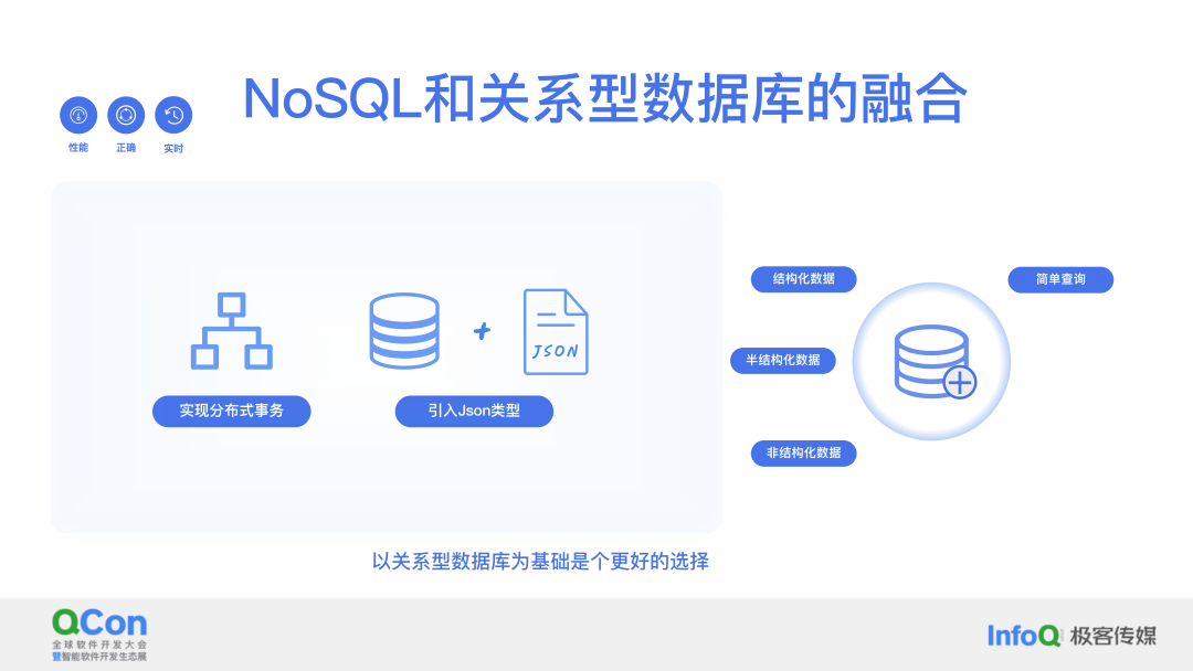 关系型数据库加持了分布式事务和半结构化数据能力之后,它就涵盖了 NoSQL 的所有优势。我们也在简单查询的场景构建了一个同时保证性能、正确性和实时性的极致系统。