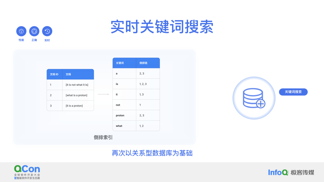 除了类型外,关系型数据库另一个扩展机制是索引类型。我们可以在关系型数据库中引入倒排索引来实现高性能搜索。而且这种倒排索引的应用不仅局限在关键词搜索上,我们同样可以用倒排索引来索引表中的结构化数据。这些倒排索引就可以用来加速这些结构化数据的联合搜索和过滤。因此,我们再次以关系型数据库为基础,通过吸收搜索引擎的倒排索引技术,打造了一个同时满足性能、正确性和实时性的极致方案。