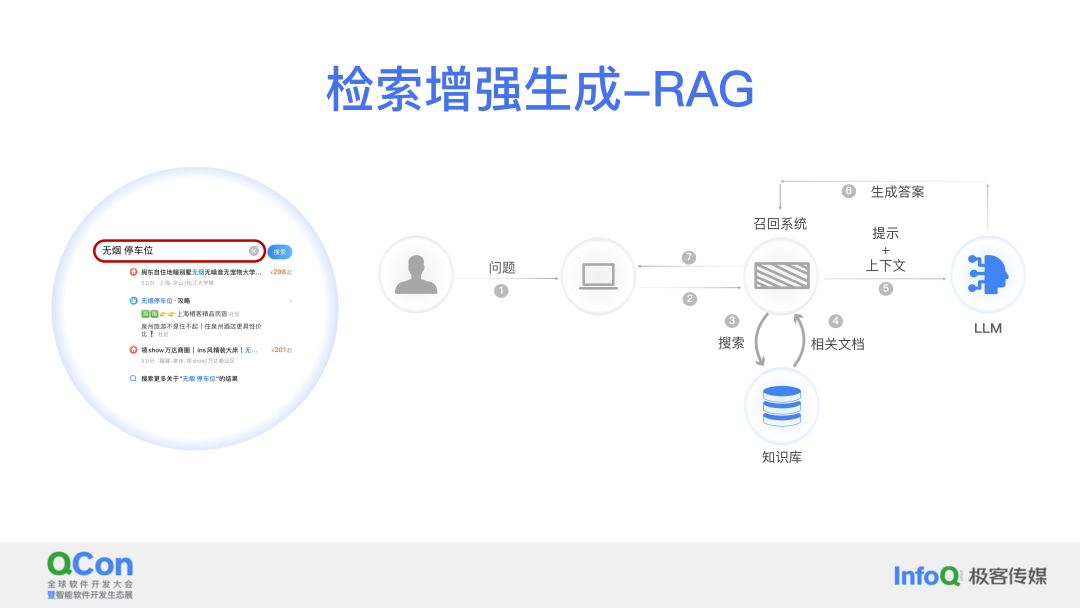 简单介绍下 RAG 的工作流程:当用户向系统提出问题时,系统会将问题提交给召回系统。召回系统可以在知识库中进行搜索,这种搜索可以是基于关键词的。例如,对于提到的“无烟 停车位”,知识库会返回与这些关键词相关的文档。然后,将系统提示、用户问题和这些召回的文档作为上下文输入给大语言模型,在充分理解问题并阅读召回的文档后,大语言模型生成答案并返回给用户。通过这种方式,我们可以把大语言模型的能力在私有领域数据上发挥出来。