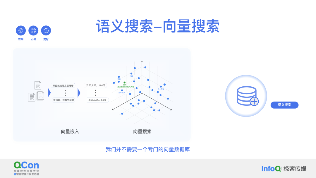 如果使用一个专门的向量数据库,就会依赖同步任务去同步数据,就可能有数据延迟。更好的做法是在关系型数据库中引入向量类型,这样能够很好地表达高维向量。当系统有上亿的文档的时候,在高维空间中它们对应着上亿个向量,找出和某个向量最近的一些向量计算量非常大。这时我们就需要用到关系型数据库的索引的扩展能力。我们会为这些向量创建一种新的索引,也就是向量索引,最常见的向量索引有 IVFFlat 或者 HNSW。在创建了向量索引后,寻找一个向量相近的向量就变得非常高效。把向量检索和大语言模型的能力结合起来就能够进行高效的语义搜索。我们并不需要一个专门的向量数据库,以关系型数据库为基础能够打造出一个同时保证性能、正确性和实时性的语义检索系统。