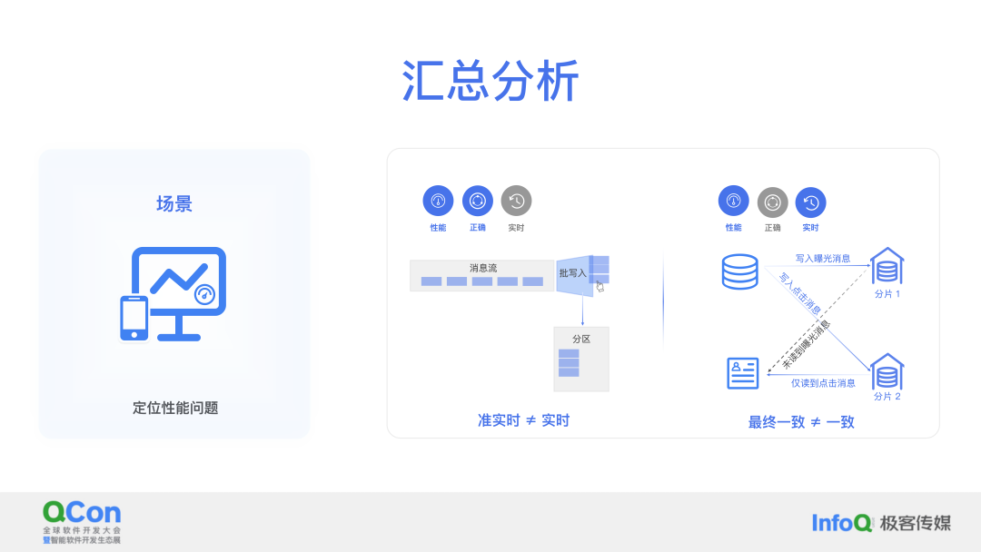 我们仍然先解释一下实时性在汇总分析的场景中的重要性。前文架构里的数仓中不仅存储了民宿和客户信息,还存储了应用和服务运行的性能信息,以帮助发现和定位性能问题。运维在监控上发现性能问题后,需要快速理解应用为何慢,是全体用户都慢还是部分用户慢。如果是部分用户慢,运维会检查在不同应用版本、不同手机型号、网络类型等情况下性能是否存在差异。经过一系列即席查询,运维最终定位到可能是某些特定情况下的配置问题。修改配置后,运维立即再次检查受影响用户的性能是否已恢复。数据的实时性直接影响了运维解决问题的迭代速度,因此实时性越高越好。