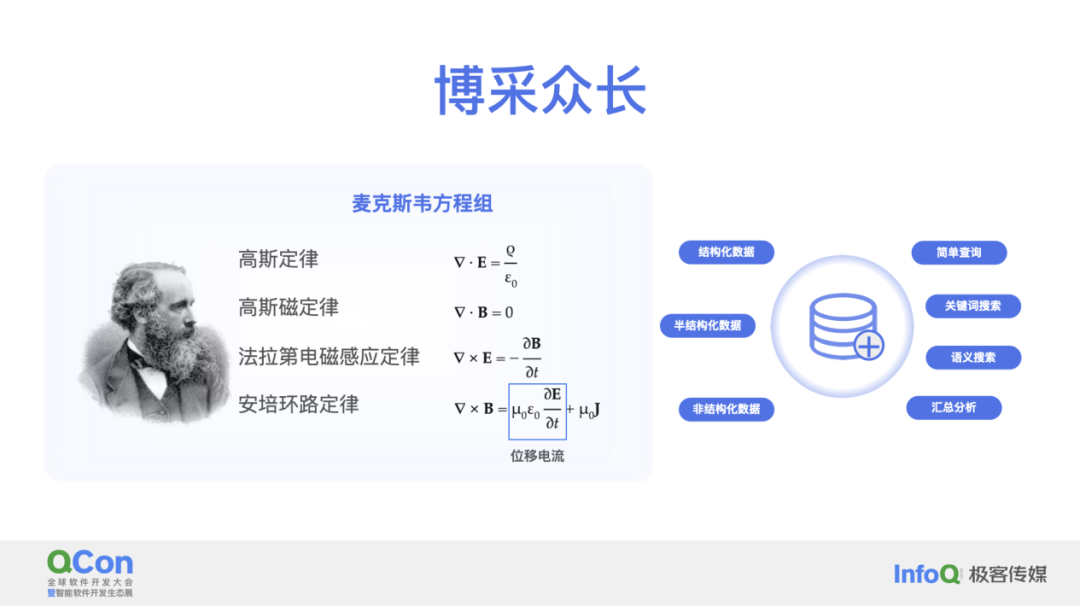 在刚才讨论的四个场景,我们都决定以关系型数据库为基础,吸收了其他系统在性能上的优化技术,从而在性能、正确性和实时性方面都达到了极致。这些性能优化技术不仅互相不冲突,而且相辅相成。我们完全可以像麦克斯韦一样,将这些性能优化技术同时吸收到一个系统中。这样我们就拥有了一个能够同时存储和处理结构化数据、半结构化数据和非结构化数据的系统,而且在简单查询、关键词查询、语义查询和汇总分析场景下都能够满足业务对性能、正确性和实时性的极致需求。