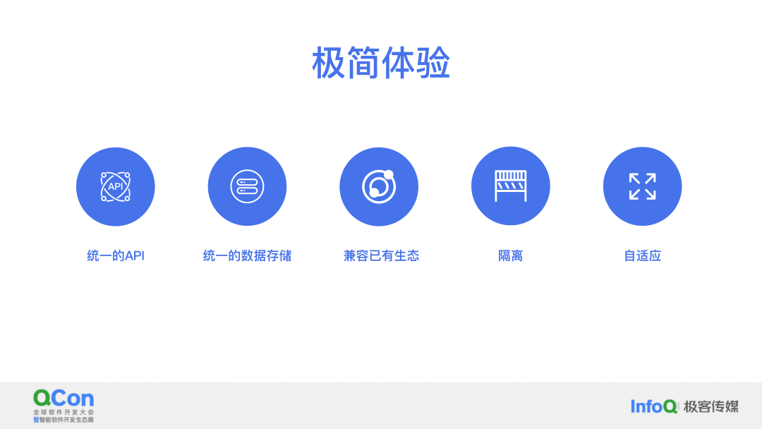 极简体验:同时它为开发和运维提供了极简体验,对外提供统一的 API,统一的数据存储,兼容已有生态,提供不同工作负载间的隔离,通过自适应根据场景做针对性的优化。