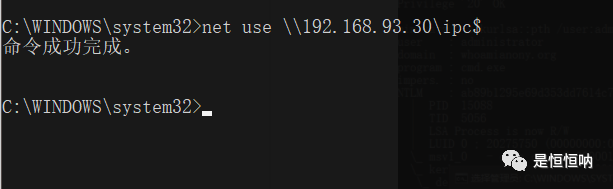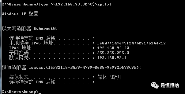 net use \\192.168.93.30\ipc$ "Whoami2021" /user:administrator 建立ipc连接type \\192.168.93.30\C$\ip.txt