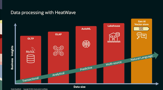 HeatWave是一个快速发展的数据库相关技术,过去从MySQL开始提供了OLTP能力,到后来的OLAP的分析能力;2022年增加了AutoML技术,允许用户利用AutoML自动化构建机器学习模型,包括使用聚类、分类和推荐等能力;2023年又推出了Lakehouse,用户不需要将数据装载到数据库中,而是直接从对象存储中查询和读取数据。而就在今年7月,我们推出了生成式AI的能力,可以利用自然语言来进行相关操作。
