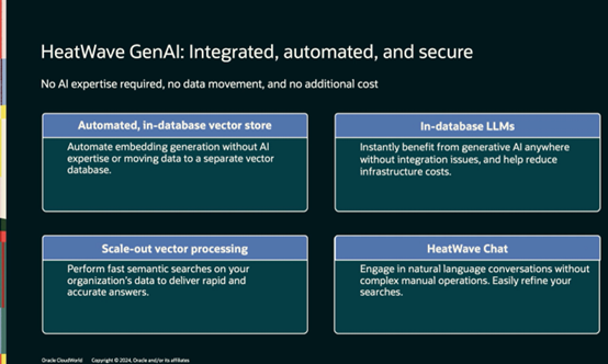 HeatWave生成式AI是集成的、自动化的且安全的。您不需要AI专家,并且不需要做数据迁移。内置了向量数据库以及大语言模型,客户可以选择数据库外的大语言模型,但是很多客户都选择了使用数据库内置的大语言模型,我们也给您提供了聊天工具,方便您使用对话的方式来和Heatwave交互。