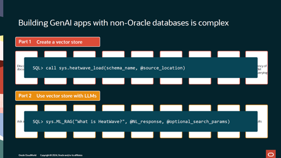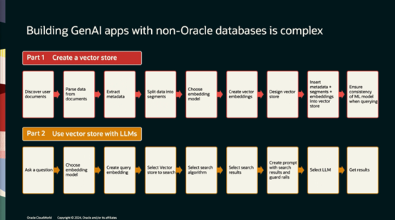 使用非Oracle数据库构建生成式AI是复杂的,我们看到创建向量数据和使用大语言模型来利用向量数据都包含很多的步骤。重要的是花费了大量时间来构建这些应用。