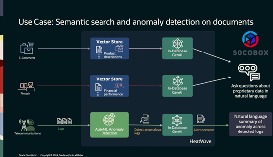 SOCOBOX采用两种方式使用HeatWave。 第一种方式是他们帮助他们的客户打造聊天机器人(ChatBox)。他们帮助客户利用HeatWave的生成式AI能力打造聊天机器人:很多客户的数据都存在数据库中,比如提供产品介绍,财务表现等等,利用向量化数据并存储到数据库中,可以进行语义检索并为客户生成相应内容。另外一个方式是使用了AutoML来做异常检测等功能。传统方式都是利用查看日志,分析然后发现问题,但这是非常耗时的。所以他们结合了AutoML能力和生成式AI的能力,来做更好的分析检测和问题定位。