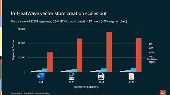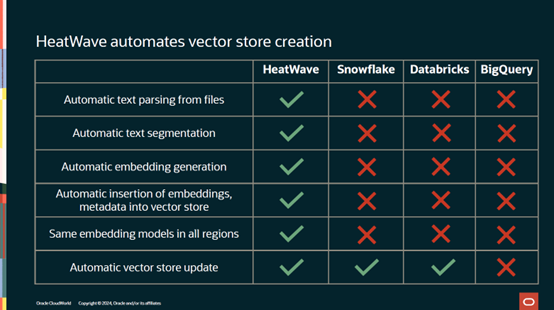 HeatWave自动化了向量存储的创建,这是个独特的能力。通过对比Snowflack, Databricks 以及BigQuery这些产品,我们可以看到只有HeatWave自动化了向量存储的创建全过程。