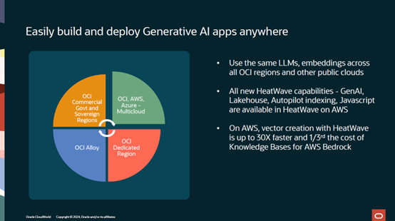 随后Edward Screven介绍了多云的选项,客户往往会选择几朵云,客户可以在AWS, Azure上使用HeatWave,也可以在OCI的专有区域以及Alloy上使用HeatWave。HeatWave在所有这些部署方式上都可以使用。同时作为对比,在向量创建上HeatWave要比AWS的 Knowledge Bases for Bedrock快30倍,价格只有其三分之一。