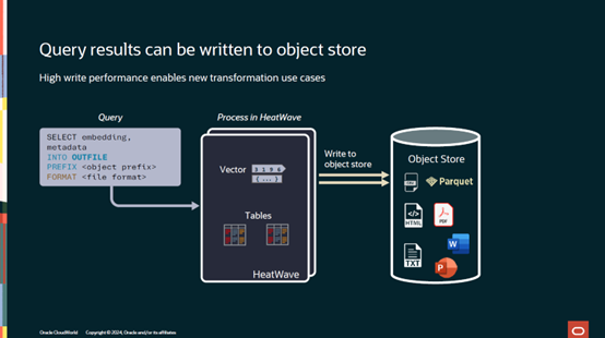 而在HeatWave里,如上图所示,如果你想创建向量存储,只需使用一句Heatwave SQL语句即可;同样使用大语言模型也只需要一句SQL语句。