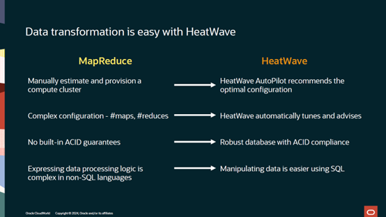 然后Edward Screven使用数据转换做了一个对比。他提到用传统方式做数据转换往往会用到MapReduce等工具,但是都相对较为复杂。你需要手工构建集群,完成复杂的配置,并且往往没有内置的ACID的保证,同时使用非SQL语言表示数据处理逻辑较复杂。而使用HeatWave这些问题都变得简单:HeatWave提供从使用SQL操作数据,自动优化配置到内置的ACID合规性等使您可以聚焦在业务问题本身。