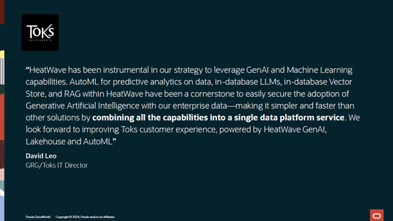 通过将所有功能整合到单一数据平台服务中,我们可以比其他解决方案更简单、更快速地实现这一目标。我们期待在 HeatWave GenAI 、 Lakehouse 和 AutoML 的支持下,改善 Toks 的客户体验。”
