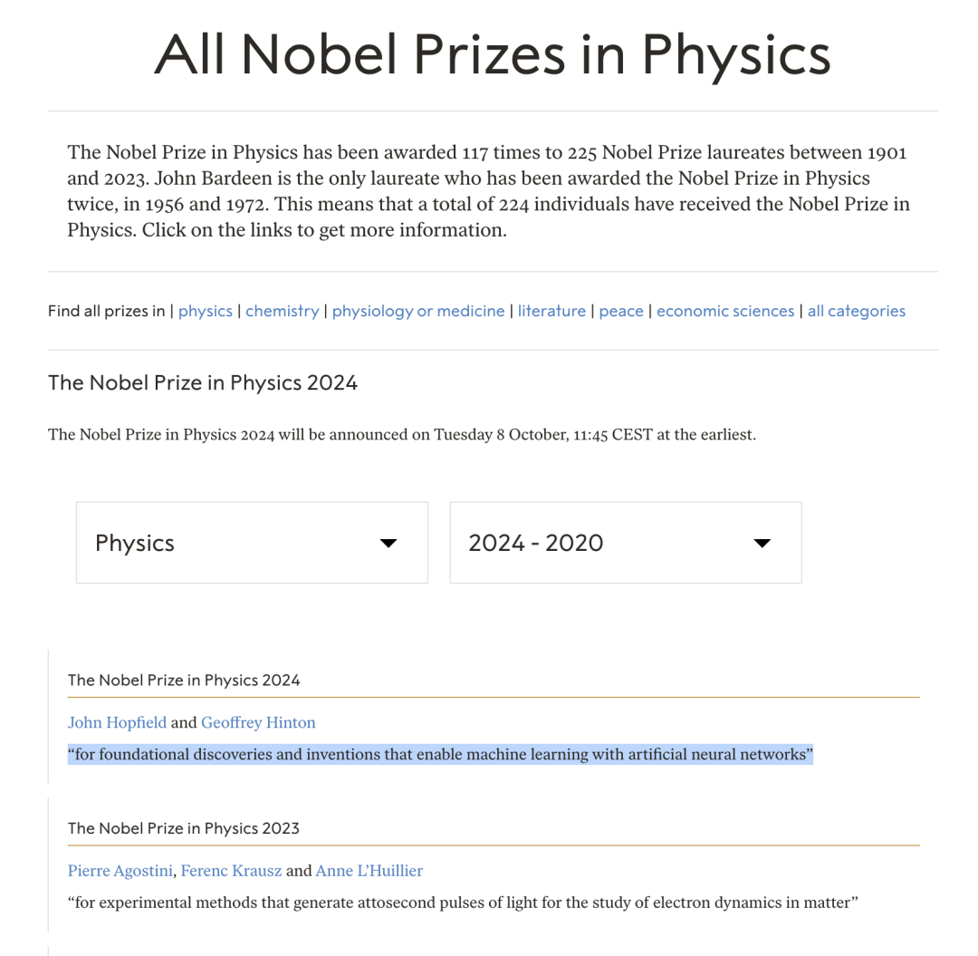 引用央视报道:瑞典皇家科学院当地时间10月8日宣布,将2024年诺贝尔物理学奖授予约翰·J·霍普菲尔德(John J. Hopfield)和杰弗里·E·辛顿(Geoffrey E. Hinton),表彰他们在使用人工神经网络进行机器学习的基础性发现和发明。