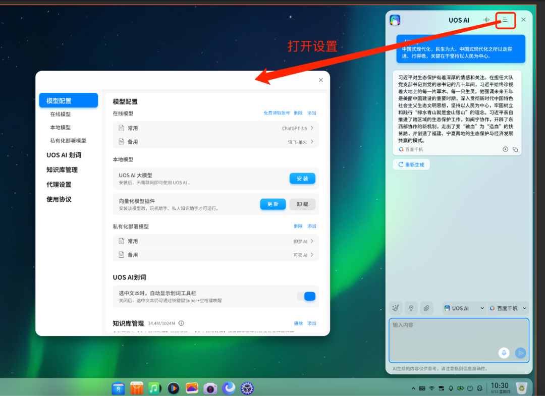 UOS AI随航使用的大模型是和UOS AI桌面智能助手一致的模型,智能助手切换大模型,随航的大模型也会切换;