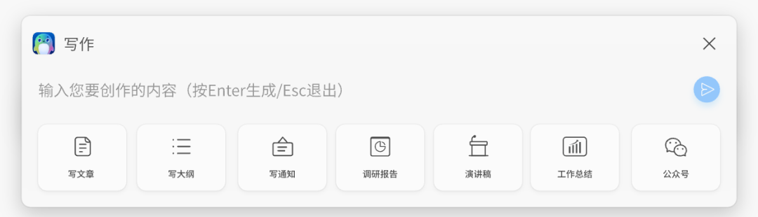 撰写文案,是日常办公中一个非常高频的场景。在系统内大多数输入状态下,使用快捷键super+空格键即可唤醒UOS AI写作工具,辅助多种形式的创作。