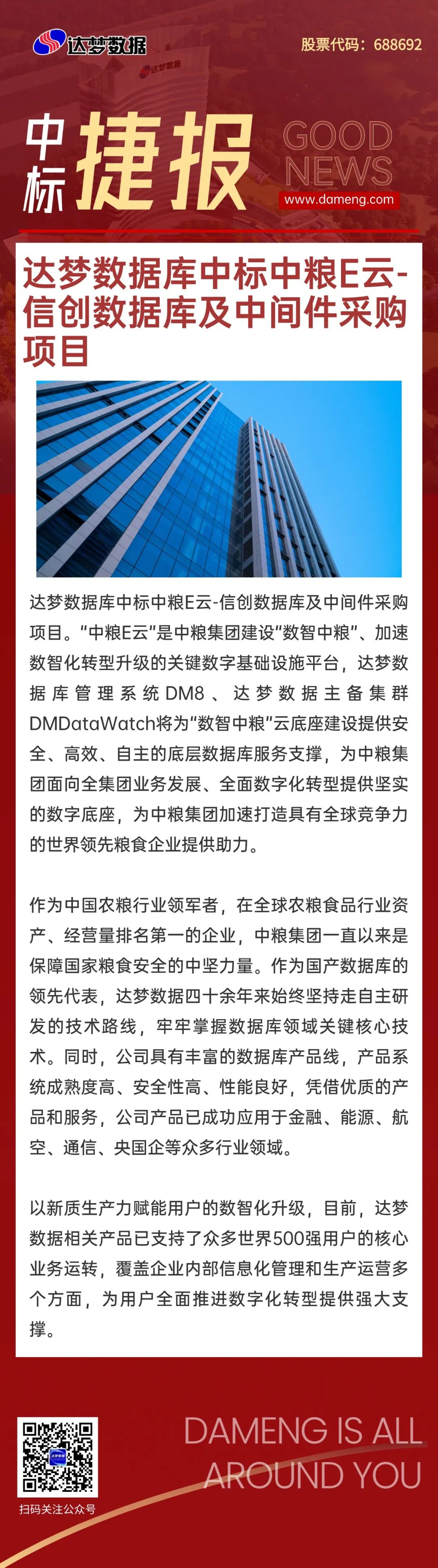 达梦数据库中标中粮E云-信创数据库及中间件采购项目