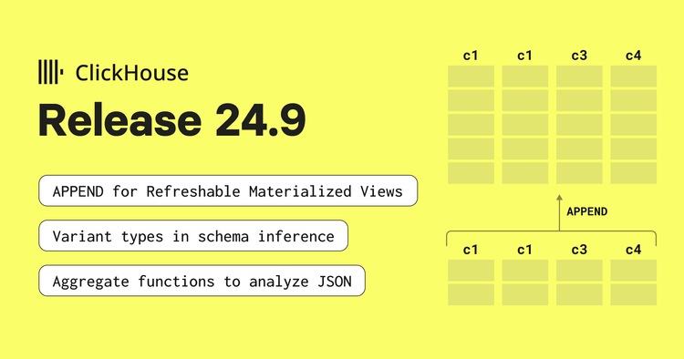 本次ClickHouse 24.9 版本包含了23个新功能🎁、14项性能优化🛷、76个bug修复🐛