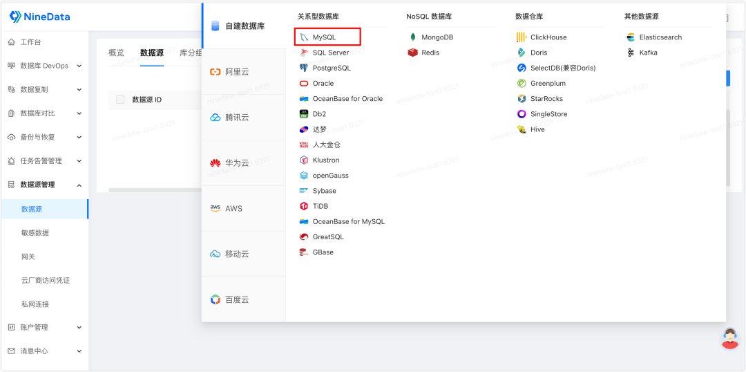 1. 登录 NineData 控制台,单击数据源管理>数据源,然后在页面中单击创建数据源,选择需要录入的数据源。