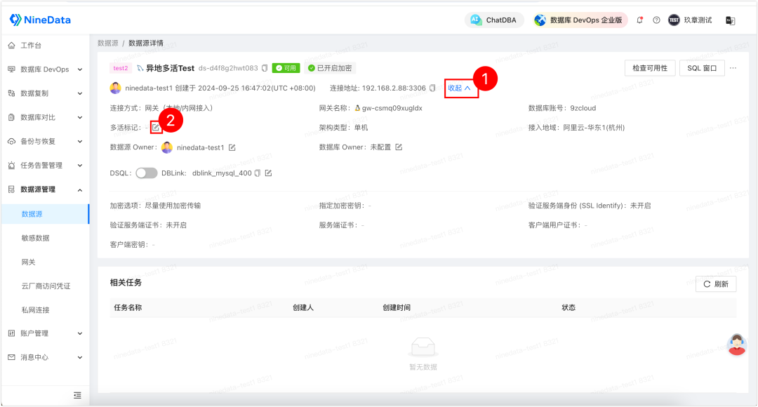 3. 单击数据源 ID 进入数据源详情页面,单击展开,找到多活标记,配置多活标记名称。该步骤所有参与复制的数据源都需要执行,以防止发生数据循环复制。步骤二:创建数据源 A、B、C 之间的双向复制任务