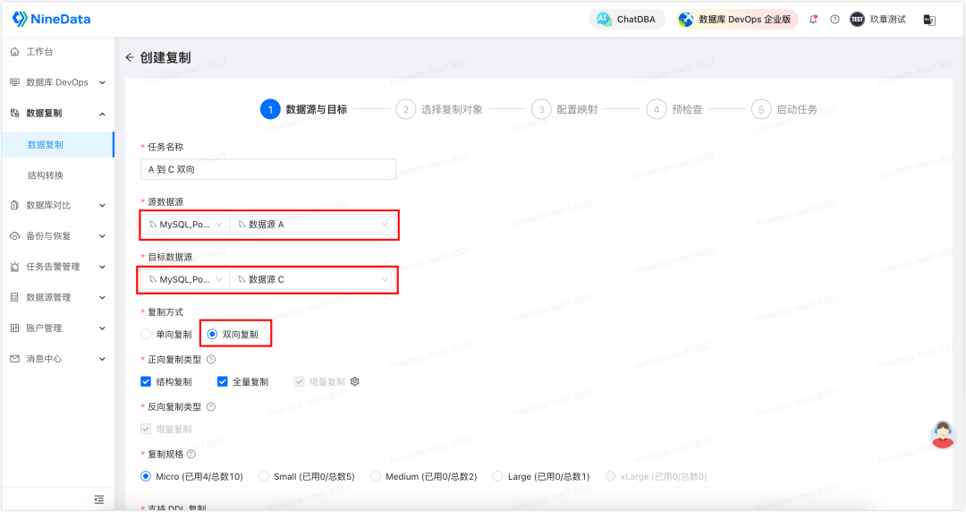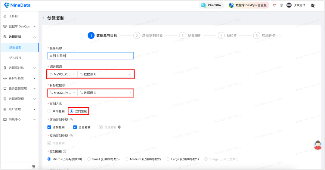 2. 根据页面提示配置复制任务,源数据源处选择数据源 A,目标数据源处选择数据源 B,然后在复制方式处选择双向复制。