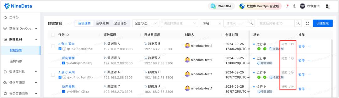 4. 根据页面提示完成配置后,在数据复制的任务列表中可以看到多了 2 条双向复制任务,当正反向任务的延迟为 0 的时候,代表数据源 A、B、C 之间的数据是一致的。