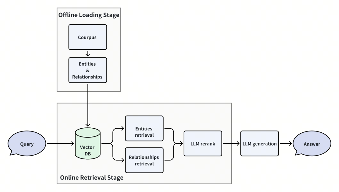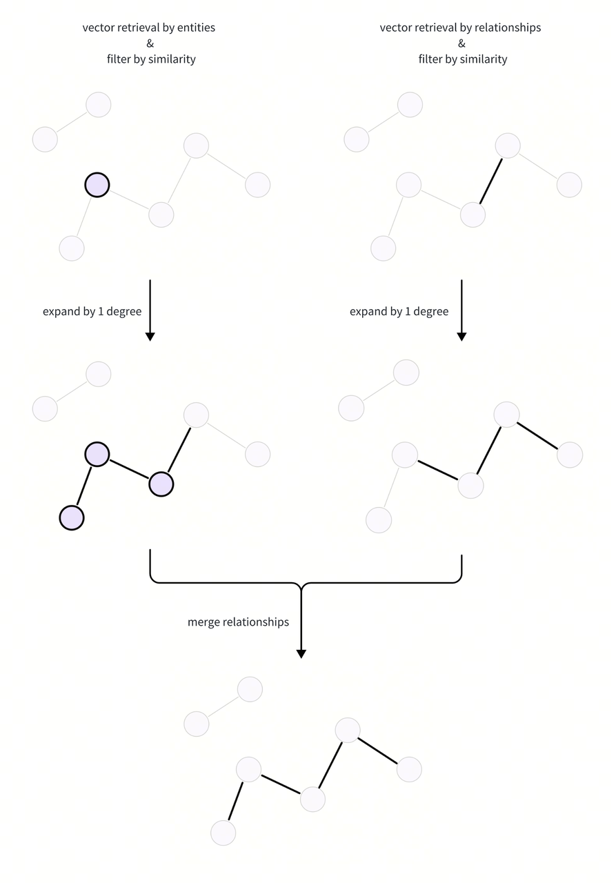 对于输入的 Query,我们遵循常见的 GraphRAG 中的范式(如HippoRAG,MS GraphRAG),将 query 提取 entities,对于每个 query entity,转换成 embedding,分别对 entity collection 进行 vector similarity search。然后将所有 query entities搜索得到的结果进行合并。 对于 relationship 的向量搜索,我们直接将 query string,转换成 embedding,对 relationship collection 进行 vector similarity search。