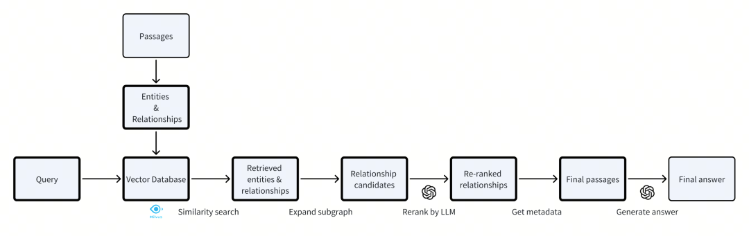LLM 返回精确排序后的 relationships。我们只需要取出先前在存储中的对应 relationship 信息,从中获取相应的 metadata,在那里有对应的 passage ids。这些 passages 信息就是最终被 retrieved 到的 passages。后续生成回答的过程和 naive RAG 一样,就是将它们放入 prompt 的 context 中,让 LLM 给出最后的回答。