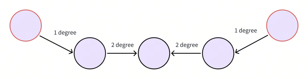 基于跳数有限性,我们仅需要扩大较小的度数(如1,2等),就能涵盖大部分可能有助回答的 relationships。请注意,这一步扩展的度数的概念和回答问题总共需要的跳度的概念不同。比如,如果回答一个 query 问题涉及两个相差 n 跳的 entities,那么实际上往往只需要扩展 ⌈n 2⌉ 度就可以,因为这两个 entities 是被向量相似召回后的两个起始端点。如图,向量召回到了两个红色的 entities,只需要从它们开始,相向扩展 2 度,就能覆盖到 4 度的跳数,这足以回答涉及到这两个 entities 的 4 跳问题。