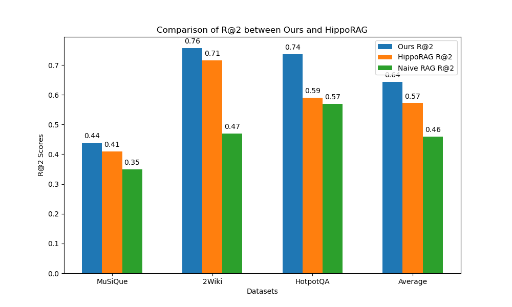 On the multi-hop datasets, our method outperforms naive RAG and HippoRAG in all datasets, all of them are compared using the same facebook/contriever embedding model.