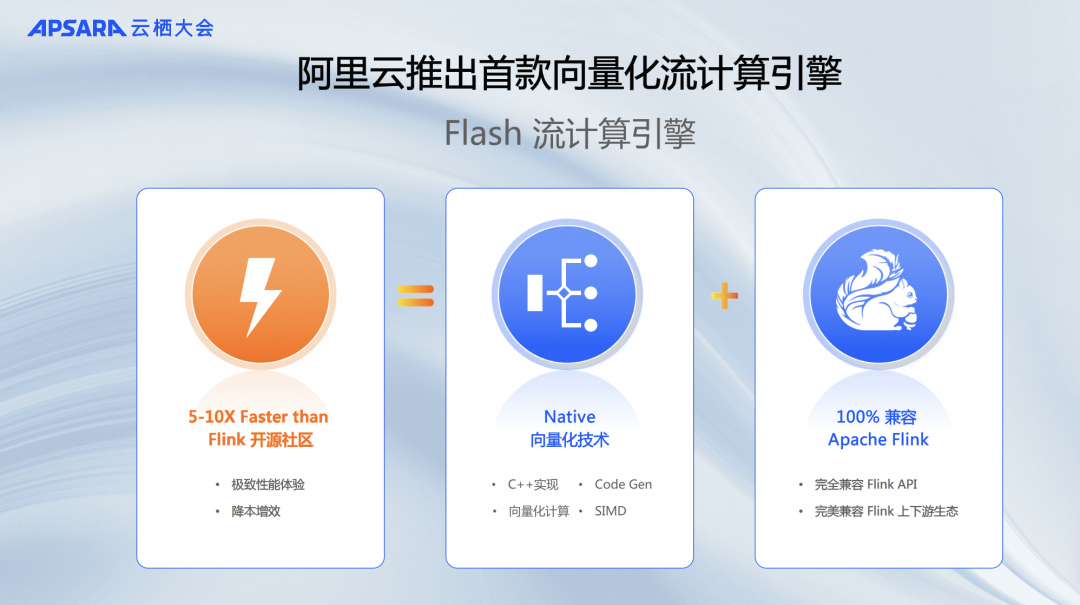 基于向量化的大数据计算技术在近几年呈现爆发趋势,Databricks 推出了向量化 Spark 引擎-Photon,Facebook 开源了 Velox 向量化批计算引擎。向量化计算推动离线批计算能力大幅提升,与此同时业务时效性的提升也让企业对于实时流计算有了更多的需求。在这样的背景之下,9月20日2024年云栖大会之上,阿里云阿里云智能集团研究员、开源大数据平台负责人王峰宣布阿里云实时计算 Flink 产品推出业界首款向量化流计算引擎-Flash,100%兼容 Apache Flink 业界流计算标准,且相对开源 Flink 具备5-10倍性能优势,助力企业在大数据实时化升级的道路上降本增效。