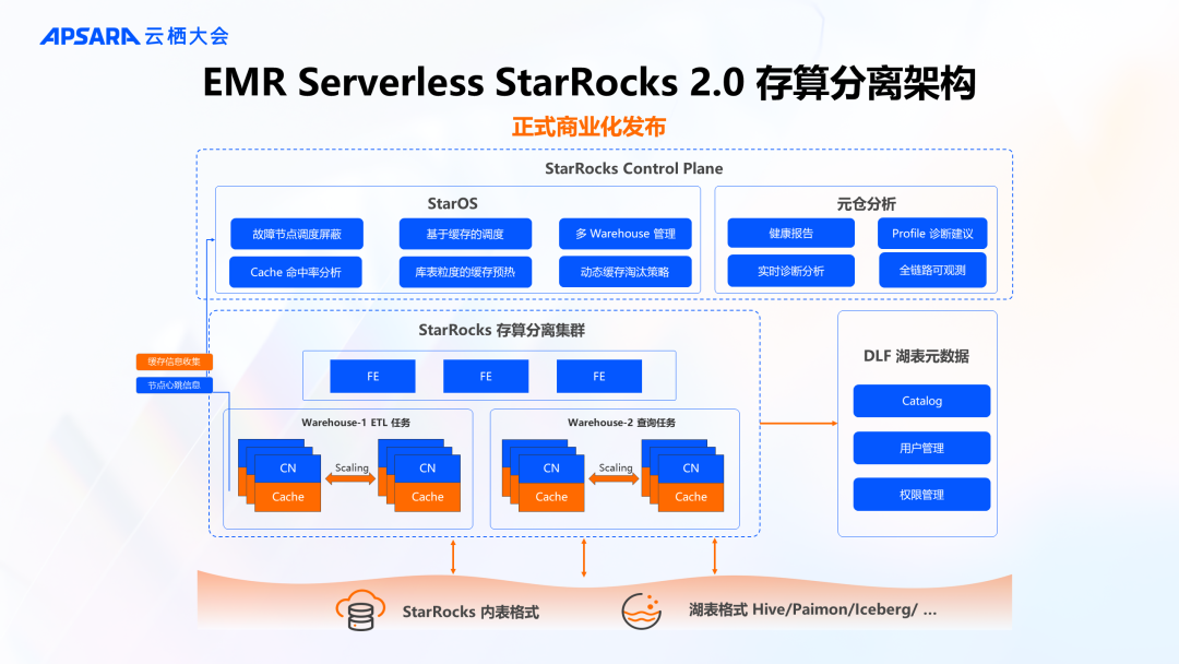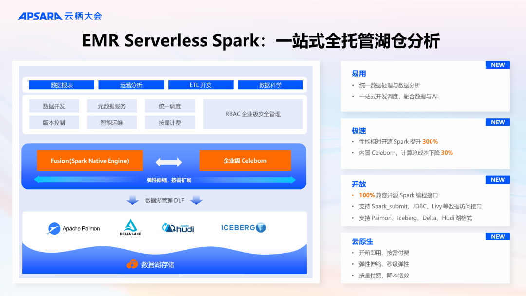 实时计算Flink版的 Flash 流计算引擎已开启邀测,欢迎用户通过工单和业务团队联系开通试用王峰表示:“我们对这项技术充满信心,计划通过阿里云向公有云领域推广,旨在服务于更多中小型客户。特别是那些已采用 Flink 的中小企业,或是云环境中的云原生企业,我们将使它们能够在无需修改代码的前提下,利用新的向量化兼容 Flash 引擎,达到降低成本并提升效率的目的。” 目前凭借在阿里巴巴内部生产环境中的超过10个业务部分,10万以上的 CU 规模进行了实际应用和业务测试,Flash 已成功助力业务方节省52%的平均成本,并展现出广泛的应用潜力。阿里云计划采取分阶段策略推广 Flash,以确保产品的稳定性和可靠性,同时也鼓励感兴趣的开发者和企业参与测试,共同探索向量化计算在大数据处理领域的更多可能。开源大数据平台实现全面 Serverless 产品化近年来随着大数据业务的快速发展和云原生技术的普及,计算服务 Serverless 化已经成为刚需,在本次云栖大会上,阿里云智能集团资深技术专家、EMR 团队负责人李钰宣布 EMR Serverless Spark 产品正式启动商业化。阿里云开源大数据平台已全面实现了 Serverless 产品化,包括 EMR Serverless Spark、EMR Serverless StarRocks、Serverless 实时计算 Flink 版等。EMR Serverless Spark 是一款云原生,专为大规模数据处理和分析而设计的全托管 Serverless 产品。该产品自研向量化 Fusion 引擎,100% 兼容开源 Spark 编程接口,相比于开源 Spark 性能提升300%;提供交互式 Notebook 以及嵌入式 SQL Editor 开发环境、并提供版本管理、工作流调度、监控诊断等一站式平台能力;支持弹性伸缩、按量付费,进一步降低计算成本。结合 DLF 新一代湖仓数据管理平台,助力阿里云客户构建兼容开源和全面开放的数据湖仓解决方案。今年是 EMR Serverless StarRocks 存算一体版本正式商业化一周年,自发布以来已在超过 500+ 生产客户,覆盖 20+ 行业落地,为企业提供稳定高效,开箱即用的全托管企业级数据平台的同时,也面临一些技术场景的挑战,在云栖大会上 EMR Serverless StarRocks 正式宣布推出商业化生产可用的 2.0 存算分离架构,提供了 StarOS 升级、Multi-Warehouse、弹性伸缩、内表优化、湖表优化等能力。近年来,通过对大数据业务和在线业务进行离在线负载混部实现降本增效,逐渐成为客户的通用诉求。2024云栖大会上 EMR 管控平台的全面升级:EMR on ACS 引入了与 ACS 的无缝集成、资源队列和定额(Quota)管理、作业监控及诊断分析功能,并新增对多计算引擎的支持;而在 EMR on ECS 产品形态中,全新推出了自动化弹性伸缩与智能化诊断分析能力。这些增强的能力都将助力客户智能化的实现在离线混部和降本增效。随着数据湖和数据仓库技术的不断演进,湖仓架构开始在数据基础设施中发挥关键作用,可帮助企业快速构建一体化数据分析平台,加速获取 AI 赋能的业务洞察,有效降低数据基础设施与管理成本。在这样的行业趋势之下,Apache Paimon 作为一种高性能、高扩展性的存储层,正成为构建实时湖仓架构的关键技术之一。阿里云智能集团高级技术专家李劲松在2024云栖大会上介绍到了 Paimon 的发展历史以及 Apache Paimon 在 Streaming+实时场景的优势。Apache Paimon 作为一种高性能、高扩展性的存储层为用户提供了数据湖实时流式处理、湖上 OLAP 加速、数据湖非结构化处理等技术方案。Paimon 自2022年从Flink社区开始孵化以来,短短两年,已在越来越多的公司及场景落地,帮助业务更实时、更开放、成本更低的构建湖仓架构。结合在2024云栖大会正式对外发布的阿里云 OpenLake 解决方案,企业可构建大数据、搜索、AI 一体化的能力体系,实现多模态数据统一纳管、多种计算引擎平权计算、大数据 AI 一体化开发,基于数据资产构筑竞争力。在2024年云栖大会的开源大数据专场上,七猫免费小说的数据仓库负责人蒋乾分享了关于云上数据仓库数据治理的最佳实践。借助阿里云 EMR 的强大技术支持,七猫免费小说成功实现了数据仓库架构与数据治理的规范化和流程化演进,核心体现在如下三个方面:- 存算分离架构的升级:为数据处理提供了更高的灵活性和扩展性。